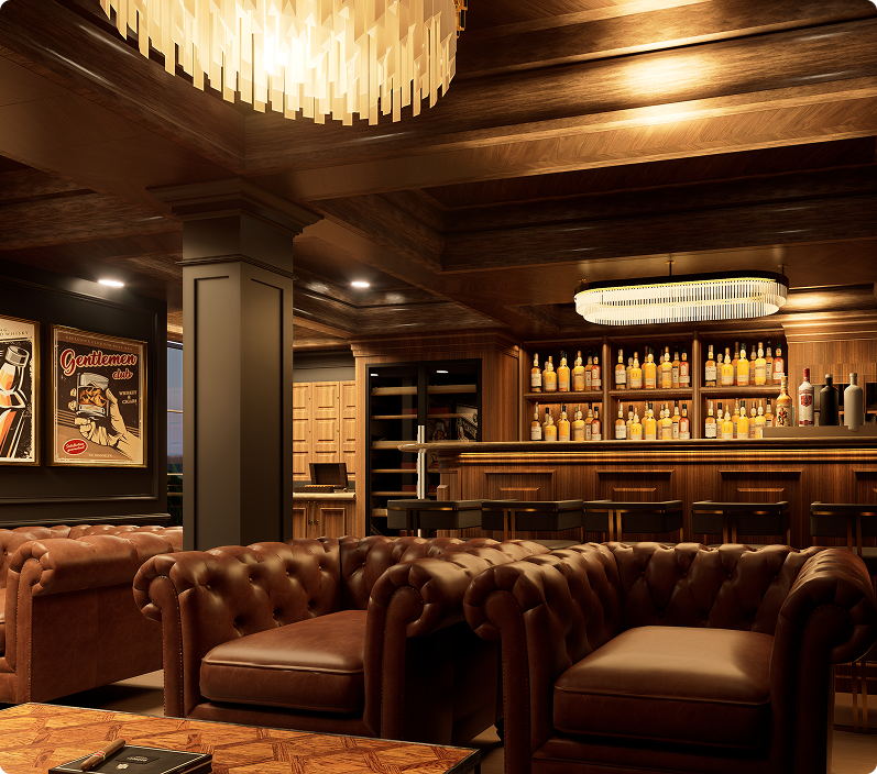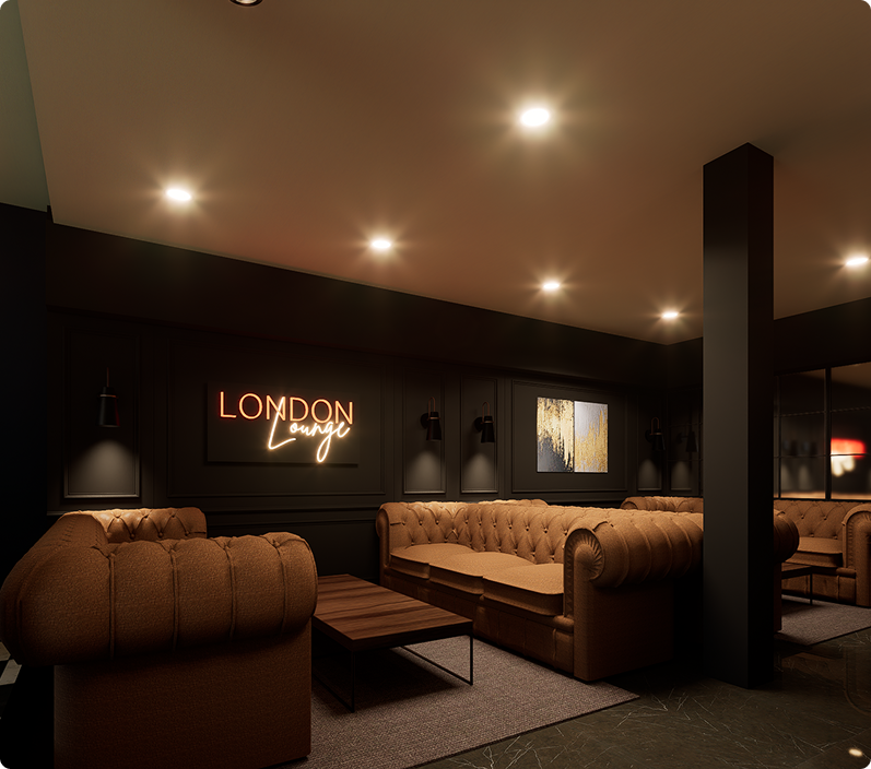 A refined all day lounge, offering a large screen TV and cocktails all day
